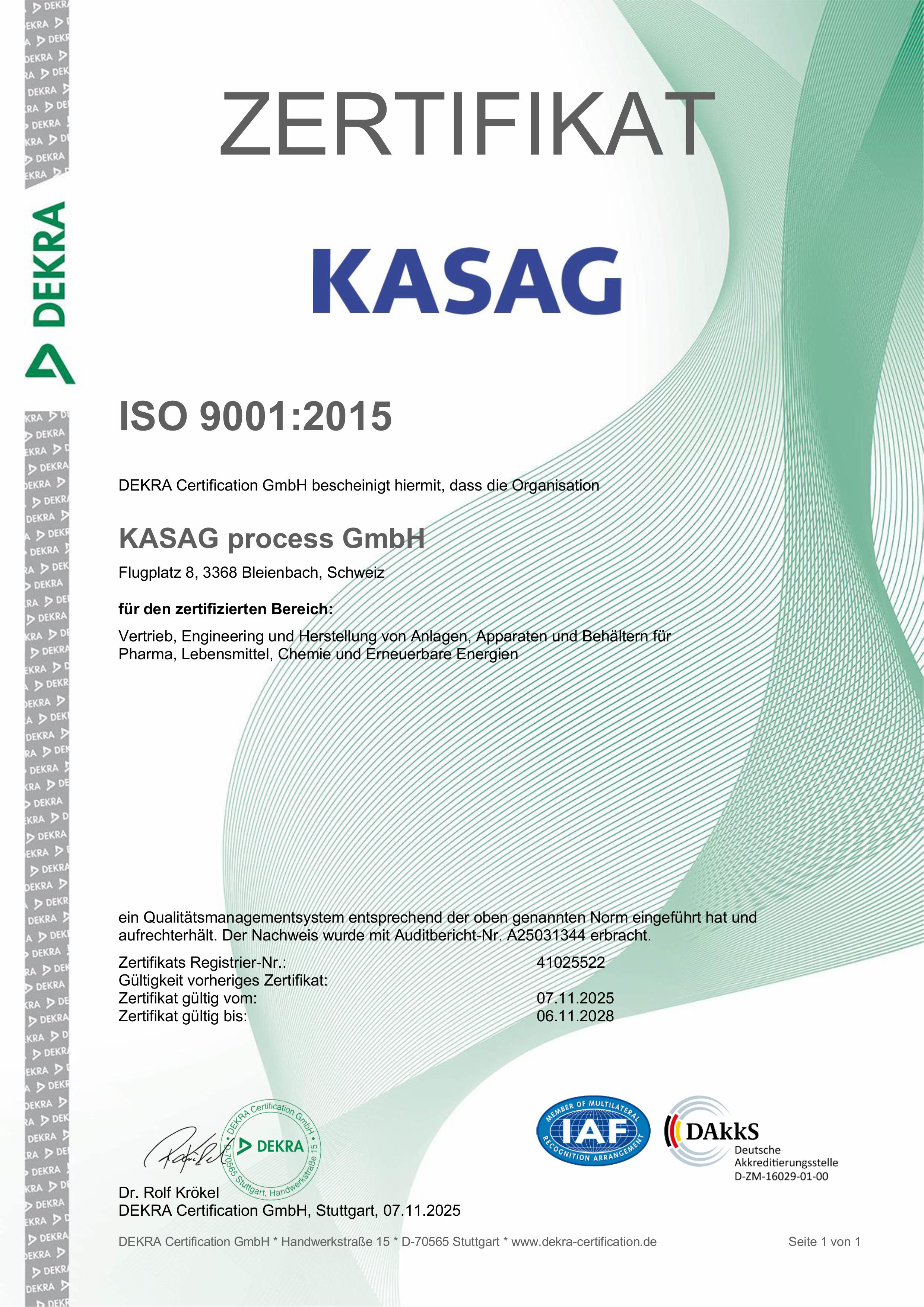 Wir freuen uns, bekanntzugeben, dass die KASAG process GmbH am 7. November 2025 erfolgreich das ISO 9001:2015-Zertifikat erhalten hat.